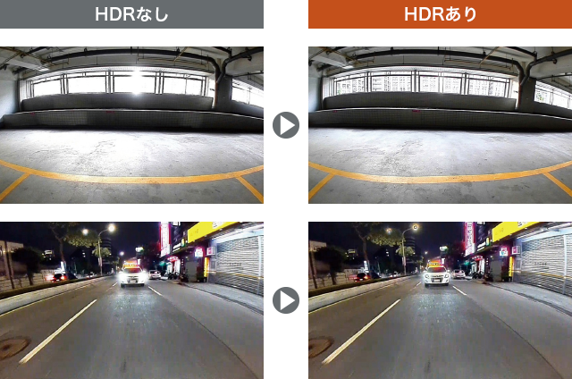 屋内外の駐車場など、強い日差しのある場所、明暗の差が大きな場所では白飛び・黒つぶれで後方が見えづらくなる場合があります。また、暗い場所で、照明の強い光や後続車のライトのためにカメラ画像が白飛びする場合があります。「HDR(ハイダイナミックレンジ)」技術は、画像の明るさをリアルタイムで自動補正し見やすくします。